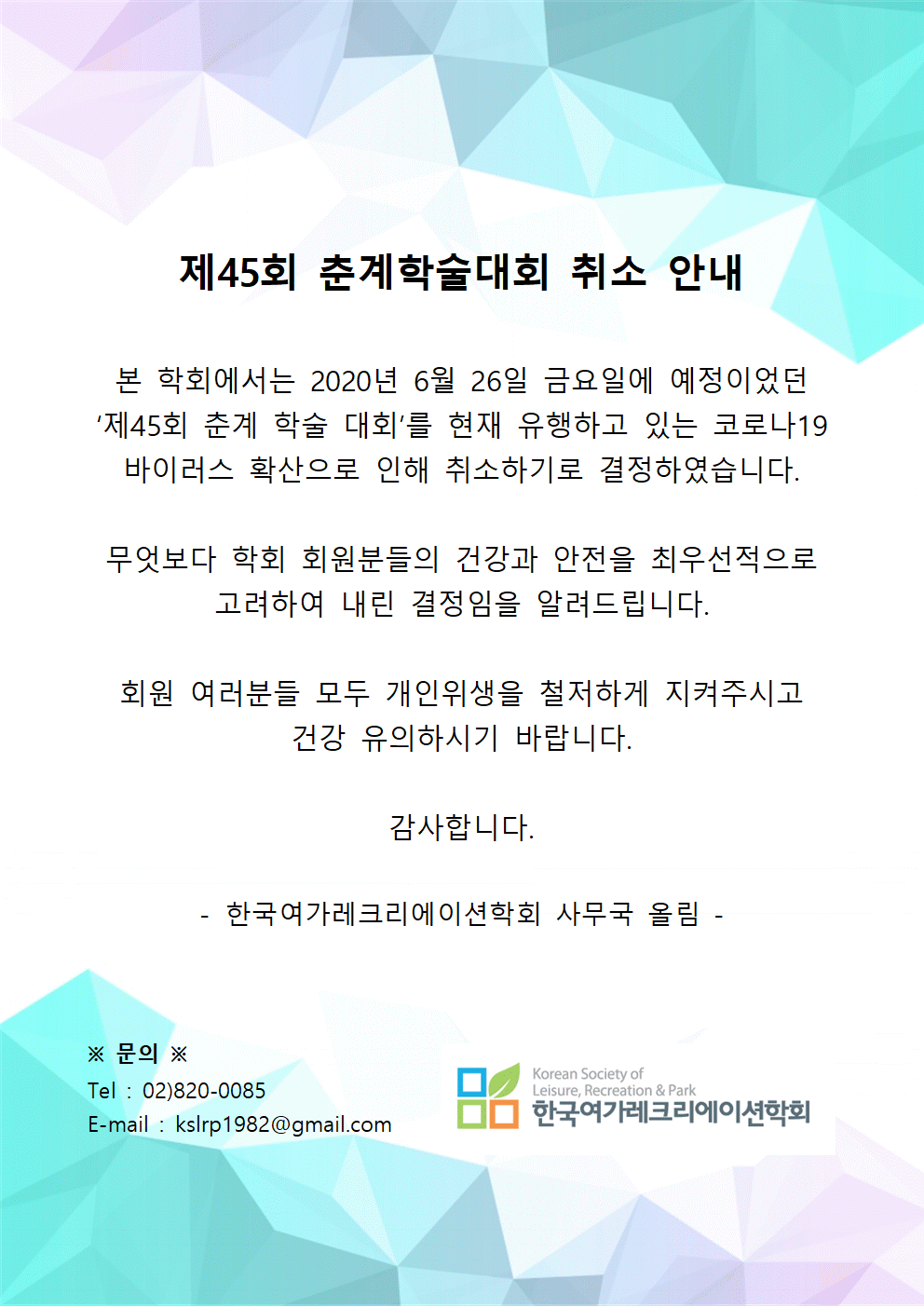 <제45회 춘계학술대회 취소 안내>