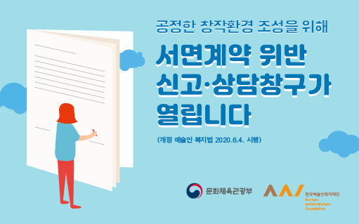 「예술인 복지법」 및 서면계약 문의사항은 한국예술인복지재단 예술인 신문고(www.kawf.kr, 02-3668-0200)로 연락주시기 바랍니다.