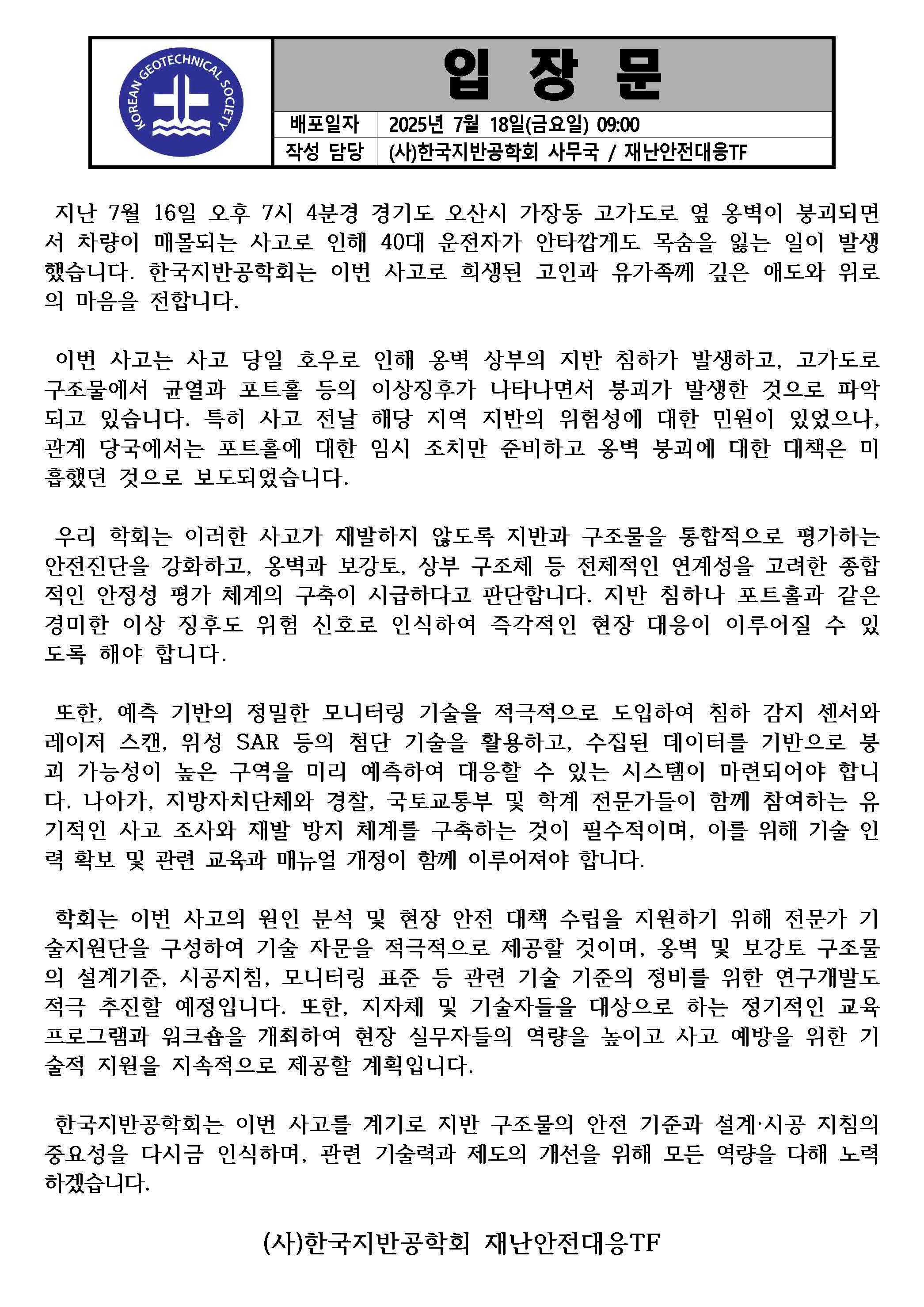 한국지반공학회 입장문_경기도 오산시 가장동 고가도로 옆 옹벽 붕괴_250718_ver2.jpg